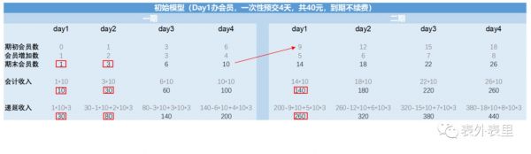 假设第一期Day1期初会员为0,新增会员为1,当天结束统计时,会员数为1;这一天首位新会员加入时平台收取了40元,其中有10元是当天的会员费,计入当日会计收入,而剩下的30元是预付未来3天的会员费,计入递延收入。以此类推,Day2新增2位会员,期末会员数为3,会计收入30元,递延收入为Day1首位会员未来2天的费用和Day2两位会员未来三天的费用,共80元。