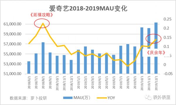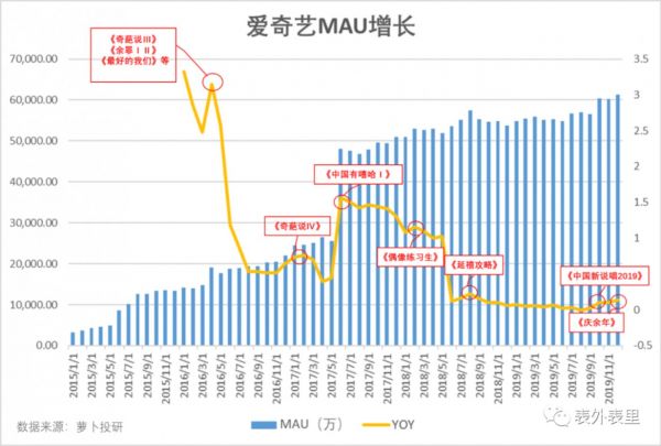 从MAU看,一旦有爆款剧出现,用户数据就会呈现激增。2016Q2《奇葩说》《余罪》等多个爆款剧播出期间,爱奇艺MAU增长达到顶峰;此后《老九门》《中国有嘻哈》等热度极高的影视综艺均会带来MAU的增长波峰。而在2019年,Q2与Q4由于《中国新说唱2019》和《庆余年》的播出,MAU增长出现小的波峰。