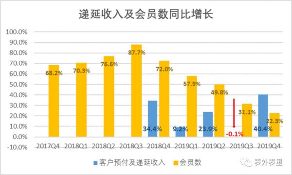 在这个假设条件下,当我们看到2018年后,递延收入的增速总是慢于会员数,甚至在2019Q3出现了负增长时,或许就会粗略认为,两者的不同步存在一定的矛盾,那么必定有一方数据是存在造假嫌疑的。