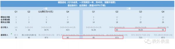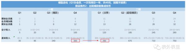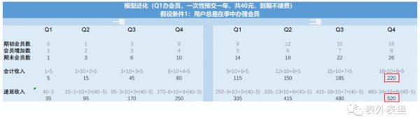 所以,我们根据季度结算规律进化了刚刚的初始模型,在其基础上增加了一个假设条件:用户总是在当季季中办理会员。一期Q1,首位会员的所带来的会计收入就变成了10*0.5=5元,递延收入为40-5=35元,后期数据以此类推。