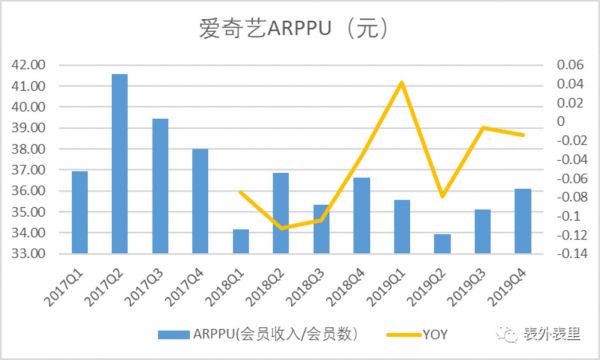 长期来看,会员数量的持续增长源于付费习惯的不断养成。而会员收入=MAU*付费渗透率*每用户付费金额,所以除会员数量增减,平台对付费金额的调整也会对递延收入产生影响。从爱奇艺财报来看,其季度ARPPU自2017Q2达到峰值后不断下降。每位会员的付费金额于2017Q2为41元,然而两年后已经降到了34元,降价将近7元。