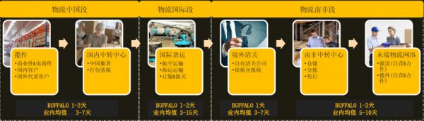 但当张鑫把开拓南非市场的想法以及当地的现状和机会告诉团队时,却遭到了极力反对,张鑫之外的其他创始成员,认为此举过于激进,几经考虑之后,张鑫选择退出快速递,重新自立门户,成立了中国到南非的跨境物流公司BUFFALO,覆盖从中国到南非整个物流全链路——南非用户在环球易购、棒谷、阿里EXPRESS等电商平台下单后,由国内集货到订舱报关、境外清关再到海外仓和本地配送,整个环节均由BUFFALO完成。