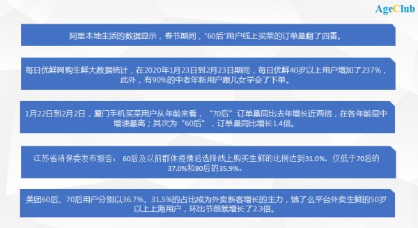 在本次疫情中生鲜电商的增量用户,很大一部分是原来被线下菜场、超市稳稳圈住的中老年消费群体,中老年大规模触网生鲜电商平台,将逐渐成为“催熟”生鲜电商的重要力量。