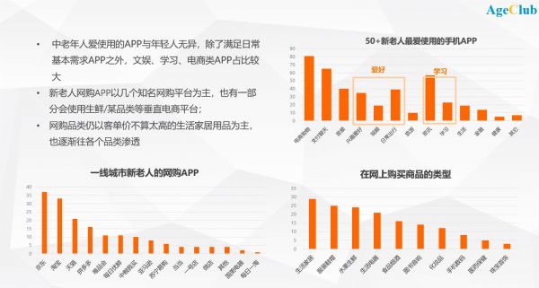 2019年我们深度调研访谈北京、广州等一线城市的50+活力中老年用户时发现,服装、生活家居,水果生鲜排在他们喜爱网购前三名。