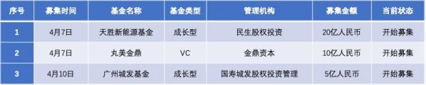 36氪经公开资料整理,本周共有3支基金正在募资,其中,天胜新能源基金和广州城发基金为成长型基金,丸美金鼎为VC。