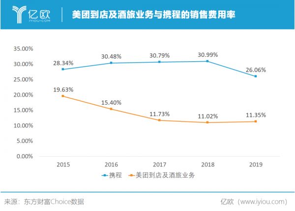 从销售费用率的对比也可以看出这一点,在美团用户养成销售习惯后,仅需几元的单客转换成本就可以诱导其使用酒旅服务,然而垂直系OTA平台获取新用户的成本却在逐年上升。