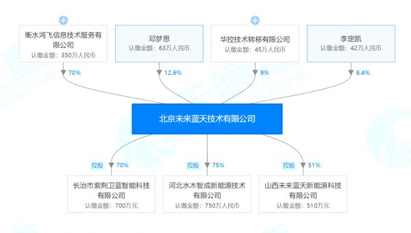 公开工商信息显示,未来蓝天董事长张静任为法定代表人,张恬悦为未来蓝天董事,注册资本为500万人民币。股权穿透图显示,衡水鸿飞信息技术服务有限公司持股70%,为第一大股东;华控技术转移有限公司持股9%。其中,华控技术为清华技术100%控股。根据公开信息,未来蓝天还曾对外发起过3次投资,投资对象分别为长治市紫荆蔚蓝智能(持股70%)、河北水木智成新能源技术有限公司(持股75%)和子公司山西未来蓝天(持股51%)。