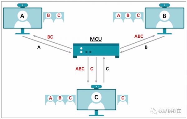 首先,A、B和C必须将自己的媒体流全部传给MCU;