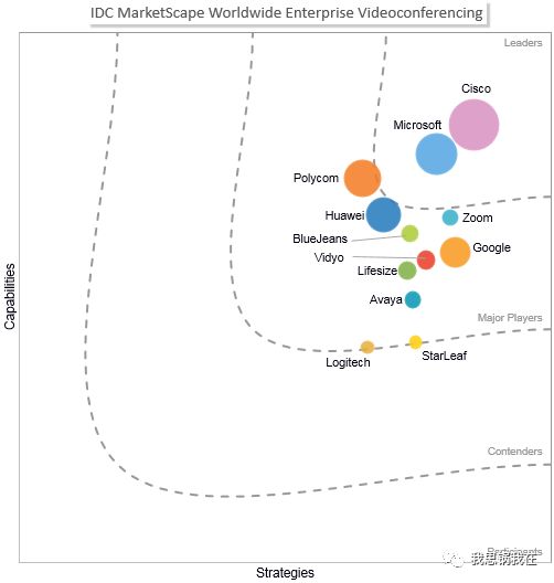 在2018年IDC发表的“全球企业级视频会议供应商评估报告(《IDC MarketScape:Worldwide Enterprise Videoconferencing 2018 Vendor Assessment》)”里也能看到,Cisco和微软(通过收购Skype)牢牢占据了领先者象限,Polycom已退居二线。
