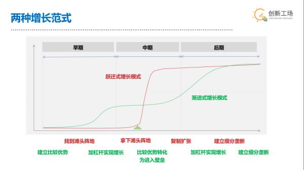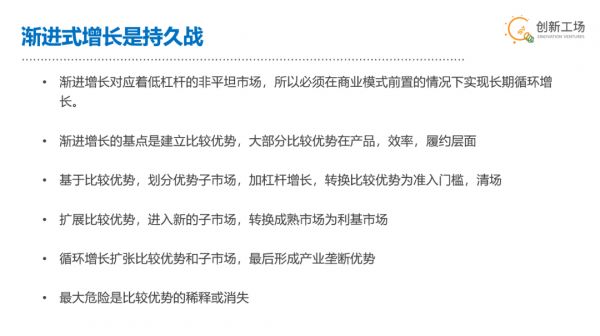 和跃迁式增长不同,渐进式增长杠杆较低,本质是持久战,是段落式的增长。核心基点在于能否建立和保持对于全市场的比较优势。