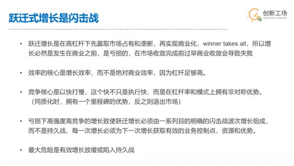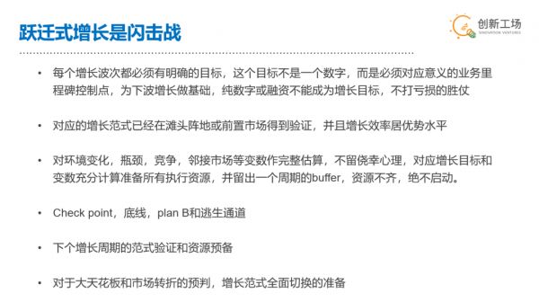 第三,跃迁式增长一旦启动,必须事先设置check point。大家打起仗来经常会打蒙了的,无论是业务判断、增长判断,还是资源、竞争判断,如果没有事先设置check point,很有可能闷头已经冲过了站,还没发现问题。
