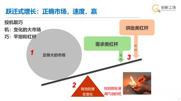 跃迁增长最重要的是找一个大而平坦的市场。在这个市场里面,我们要做的事情,必须万事俱备,只欠东风。在正确的时间点去寻找已经被汽油浸染的那张纸,并成为第一个或者第一批点火的人。