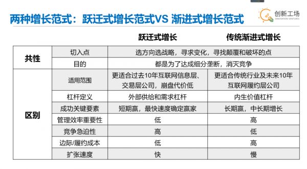跃迁式和渐进式两种增长范式都需要选方向选战略,寻求杠杆,寻找颠覆和破坏的点。前者是利用高杠杆,迅速建立细分垄断;后者是通过内部比较优势的建立,达到高业务占有率、多链条控制的实质性垄断。