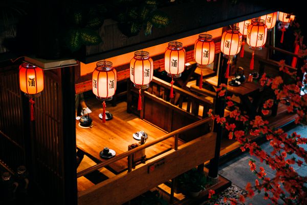 繁醉花亭的中式居酒屋选址在一线商圈,100-150平米之间,承担了场景体验和文化输出的功能。店内主打国风文化氛围,席间设计了很多中国传统小游戏,比如猜灯谜、投壶、飞花令等。近年来汉服文化兴起,繁醉花亭会举办各种汉服活动,店小二会身穿汉服去每桌敬酒,店内也为消费者提供汉服和拍照服务。