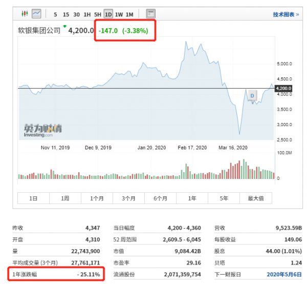 投资成绩糟糕,再加上疫情爆发,软银的股价已经从今年2月初的高点下跌将近30%,最大跌幅超50%,有一个交易日甚至创下了公司1994年上市以来的最大单日跌幅,一年内平均跌幅为25%。