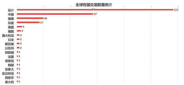 交易数量:该7日交易数据显示:全球新增117起交易事件,其中中国占总交易数量近五成,美国占全球交易数量仍不足两成份额。