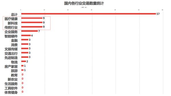 交易数量:该7日交易数据表明:交易数量排名前三的一级行业(更全行业知识图谱及细分行业统计,上鹰眼投研APP可了解全貌)分别为医疗健康、新科技、传统行业。其中,TOP3行业交易数量占总交易数量的47.37%。