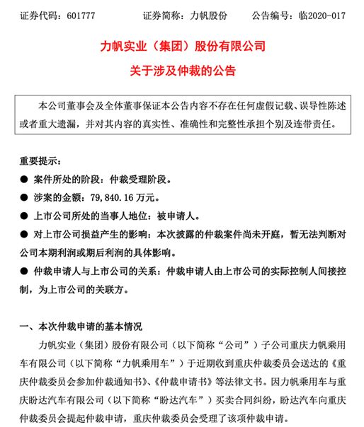 近日,力帆股份披露一则《关于涉及仲裁的公告》。据公告内容显示,重庆盼达汽车有限公司(下称“盼达汽车”)以买卖合同纠纷为由,对力帆股份子公司重庆力帆乘用车有限公司(下称“力帆乘用车”)向重庆仲裁委员会提起仲裁申请,请求裁决力帆乘用车向盼达汽车赔偿资产损失等费用共计人民币约7.98亿元。