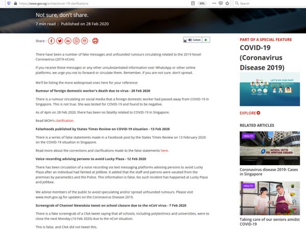 案例一,由于新冠病毒事件的迅速发展,有一些过时的错误信息,截图是政府官方页面的屏幕快照,政府的官方网站www.gov.sg于2月28日发布,有谣言“在社交媒体上流传着一名外籍家庭佣工已因为感染新冠病毒去世”。页面把之前的错误消息全文刊发,并且做了“不确定,不分享”的首要提示。简短的声明补充说,谣言是虚假的。但这个案例的不完善之处是过于简单,没有显示谣言的来历。