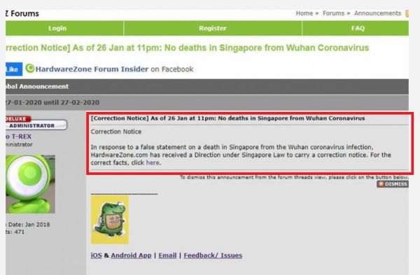 案例二:POFMA的管理范围不仅仅在正式的新闻网页,还渗透到了社交媒体网站在内的互联网平台,在自由互动平台发布谣言的人必须可能导致最高100万新元的罚款。比如,SPH Magazines 做出的一项更正指南,在这个信息帐号上运营HardwareZone论坛中,有一个论坛帖子发布谣言,声称一名男子死于新加坡的新冠病毒感染。该更正在谣言原文页面的醒目位置体现,并且用绿色标志提醒读者:目前并没有人因为病毒而死亡。
