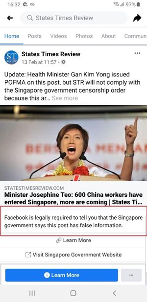 案例三:《国家时报State Time Review》网页分别在三个场合收到POFMA纠错指示,其中包括网页在新加坡的冠状病毒情况等各种问题上发表虚假信息。比如:“新加坡已经因为疫情用完口罩”;“每名中国工人将在14天的请假期间每天获得100新元,由新加坡政府全额支付”。2020年2月15日,在拒绝对发布的虚假信息进行更正之后,《国家时报》在Facebook上的展示页面成为第一个被新加坡POFMA指名惩罚的在线网站,该网页被禁止今后在新加坡获得任何经济利益。该页面由现在居住在澳大利亚的新加坡人Alex Tan Zhi Xiang拥有。新加坡政府同时要求Facebook配合用户阻止访问《国家时报》页面,Facbook虽然不怎么情愿, 但是还是遵从了POFMA法案。在图片的红色够勾勒部分,Facebook强调按照新加坡的法案,这里公布的是虚假信息。