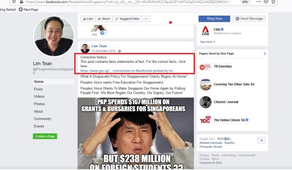 案例四:按照POFMA法案的要求,不仅是谣言发布者本人要受到法案的管理和惩罚,发布谣言的网络账号也要承担相对应的责任,必须发布醒目的更正信息。同时,转发谣言的意见领袖,也要对转发的行为负责。有一个网络大v发布了虚假陈诉,涉及政府对本地学生与外国学生的财政支出,他的内容被POFMA要求在自己网页的醒目位置发布更正信息。