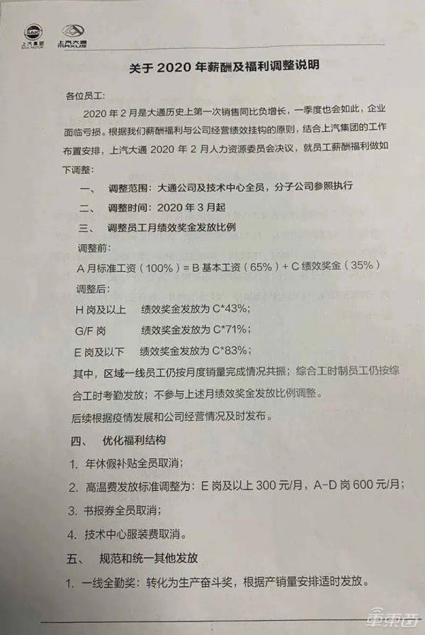3月5日,网上开始流传一份上汽大通的降薪通知,文件显示从3月份起,将对绩效工资分按级别进行下调,最高下调幅度达到83%。此外,还将取消年休假补贴、技术中心服装费以及书报券等福利。