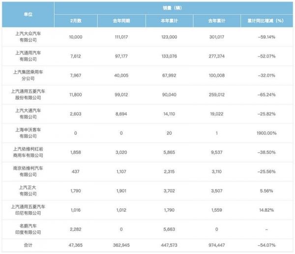 根据上汽集团发布的产销快报,整个2月,上汽生产汽车32260辆,销售汽车47365辆,同比分别下降了90.17%、86.95%。