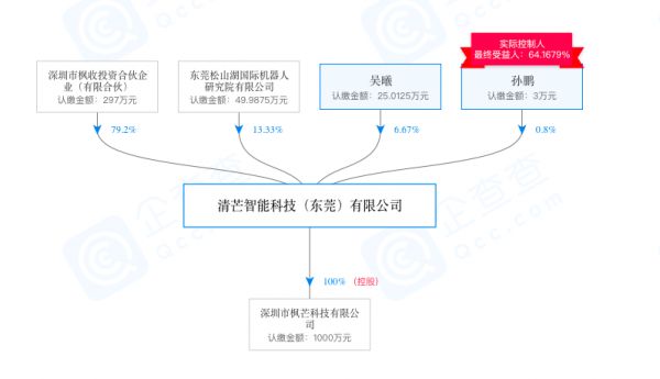 据公开信息显示,孙鹏担任枫芒科技法定代表人,陈远钦、胡涛等人任董事,注册资本为1000万人民币。股权穿透图显示,清芒智能科技(东莞)有限公司持股100%,为第一大股东,该司的股权透视图如下。
