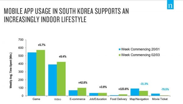 尼尔森最新研究表明,居家隔离在很大程度上增加了人们在线上平台上花费的时间。韩国,作为除了中国以外较早受到新冠疫情影响的国家和地区,消费趋势也率先呈现变化:
