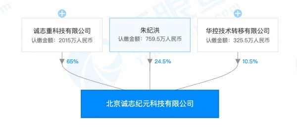 天眼查的工商信息显示,公司成立于2018年年底,注册资本为3100万人民币,其法定代表人为诚志重科技总裁任久玉,诚志重科技持股65%,比例超一半;朱纪洪持股24.5%,由清华技术100%控股的华控技术转移有限公司持股10.5%。而诚志重科技有限公司是清华控来股旗下的全资子公司,成立于2016年6月,注册资金10亿,自主研发、核心技术、关键装备为内容的“重科技”。