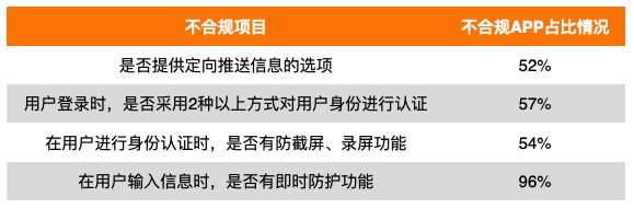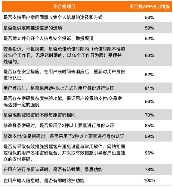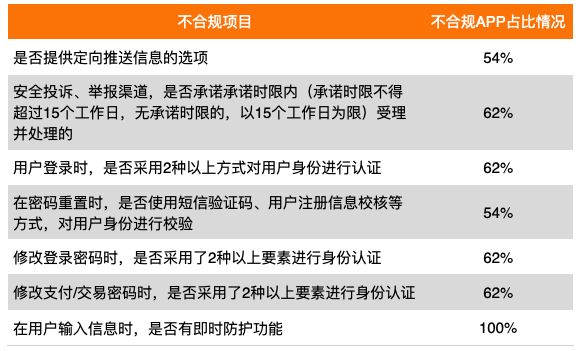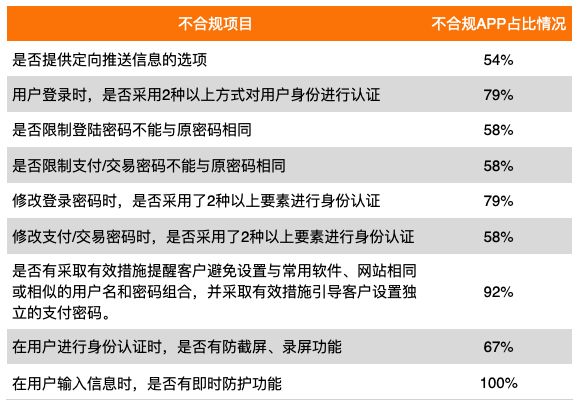 评测发现金融APP存在的主要问题包括:超过38%的APP违反必要原则,超范围收集与其业务无关的个人信息;超过56%的APP修改登录密码时,存在安全隐患;超过45%的APP在用户不同意隐私政策时,强制退出,无法使用等。