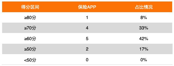 在所评测的12款保险类APP中仅有阳光保险在线APP评测得分超过80,近6成保险类APP得分在70分以下。