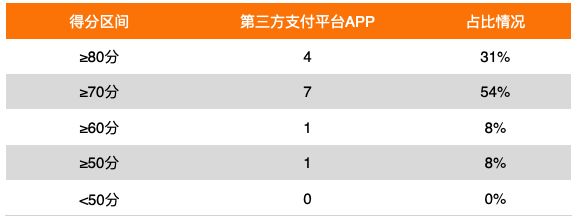 在所评测的13款支付类APP中,云闪付、和包支付、美付宝、平安壹钱包评测得分超80,超8成支付类APP得分在70以上。