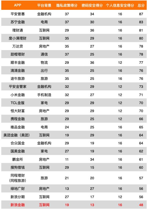 所评测的24款综合金融平台类APP涵盖金融机构、电商、互联网、房地产、通信、物流、出行、旅游、制造业等10个行业,其中平安普惠、苏宁金融、理财通、度小满评测得分超过80分。新浪金融得分最低仅为48分。