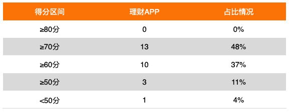 其中:综合金融平台类APP,有13款得分超70,比例为54%。理财平台类APP,有13款得分超70,比例为48%。借贷平台类APP,有17款得分超70,比例为57%。汽车金融类APP,1款得分超70,比例仅为25%。