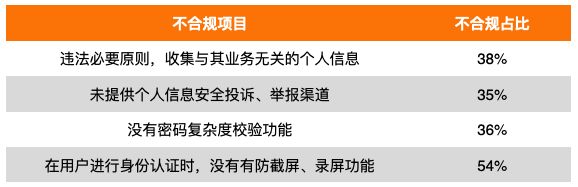 常见的不合规行为有:收集用户通讯录、通话记录、短信记录、APP安装列表;在用户注销账户时,收集用户手持身份证照片;在非网络安全和运营安全目的下,收集手机设备唯一标示。