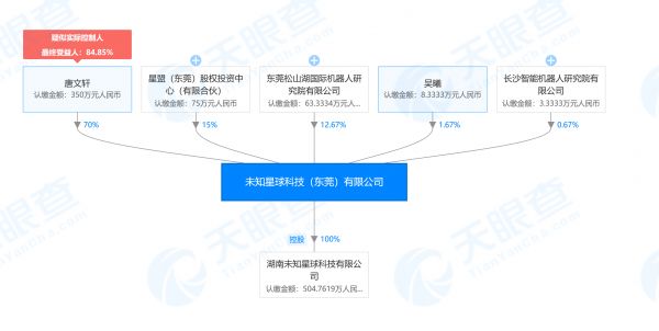 根据天眼查公开信息显示,湖南未知星球科技有限公司的母公司未知星球科技(东莞)有限公司的注册资本为500万人民币,由唐文轩担任董事长和总经理,由星盟(东莞)股权投资中心、东莞松山湖国际机器人研究院有限公司以及长沙智能机器人研究院有限公司入股。公司于2018年底获得数百万天使轮融资,由投资机构XBOTPARK基金领投。XBOTPARK基金是一家专注于机器人及智能硬件领域的创业投资机构,由李泽湘教授,高秉强教授,甘洁教授创立。LP包括红杉、高瓴等顶级基金。