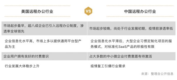 对比中美市场企业服务相关技术发展进程,以及对企业级IT服务的认知偏差等因素,美国市场整体成熟度约领先中国10-15年。知彼推己,探路中国远程办公行业的未来发展,美国市场有着值得挖掘的借鉴和对标意义。