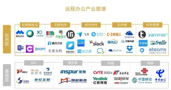 当前,远程办公相关产业可根据软硬件划分为基础层与应用层。