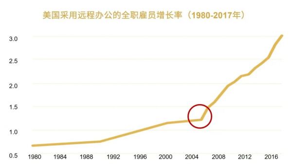 在此期间,美国先后经历了2000年互联网泡沫崩盘、2008年金融危机席卷、2009年H1N1爆发等经济、政治、公共卫生方面重大社会事件。但从数据统计看来,2005年才是远程办公市场起量的拐点年份。