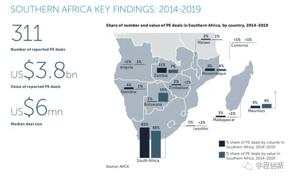 南非拥有非洲最完善的资本市场,于1888年成立的约翰尼斯堡证券交易所(Johannesburg Stock Exchange,JSE)上市公司的总市值规模排名世界前20。此外,本地私募股权发展也是非洲最成熟的。根据 AVCA的统计,2014年至2019年间,南非占据南部非洲地区私募交易总额65%以上,而且南非长久以来保持着良好的私募投资退出记录。
