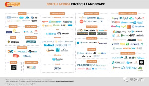 目前金融科技参与者主要集中在五个关键的职能上:支付,存款和贷款,资本筹集,投资管理和市场供应。在点对点贷款领域,南非已经成为非洲领先的个人和企业贷款市场之一。值得注意的玩家包括RainFin(对法人机构的在线贷款市场);PeerFin(个人社交借贷平台)。在投资,资产和财富管理领域,创业科技公司比较少。另外,南非金融服务提供商在认真研究机器人顾问和人工智能,以提供廉价的、更有效的金融计划服务,多家金融服务提供商已投资开发由AI驱动的投资建议平台,比如 Itransact ,经授权的金融服务提供商,推出了自动化投资平台 ItransactGO 。