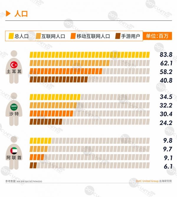 土耳其是中东第二大经济体,互联网人口约6210万,是中东最大的游戏市场,占整个中东地区近40%的市场规模,同时也是中东最具人口红利的游戏市场,其人口总数超过所有单个欧洲国家总人数,并且超过三分之一人口都是游戏玩家,手游玩家超过4000万。