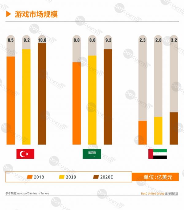 有数据显示,2019年中东手游市场规模约12亿美元,其中土耳其、沙特和阿联酋合占超过近80%市场份额。土耳其是最大的手游市场,2019年手游收入约4.4亿美元,占整个中东市场约36.4%,其次是沙特和阿联酋,分别为2.9亿美元和2亿美元。预计到2020年,中东手游市场规模将突破13亿美元,土耳其仍将继续保持其第一的市场占有率。