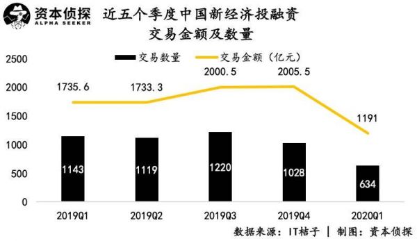 一级市场方面,根据IT桔子的数据,2020年Q1国内新经济一级市场共有投融资事件634起,同比下降44.5%;Q1投融资交易金额共1191亿元,同比下降31.4%。