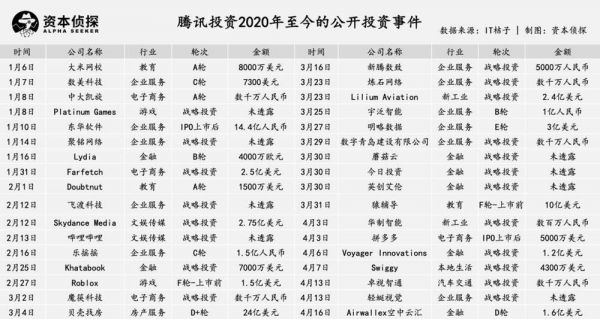 截至2020年4月16日,腾讯今年已有投资34次记录,投资方向横跨包括游戏、电商、文娱、企业服务、教育等多个行业,且包含不少海外公司。