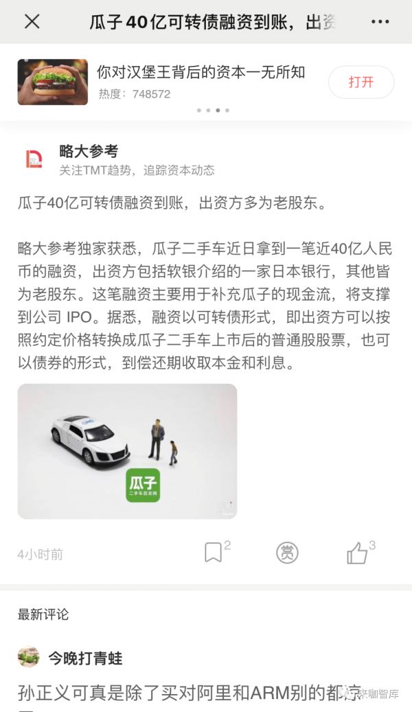 昨晚,据虎嗅报道,瓜子将发行40亿人民币的可转债。其老股东软银在找来一家日本银行,其他参与方都为老股东。