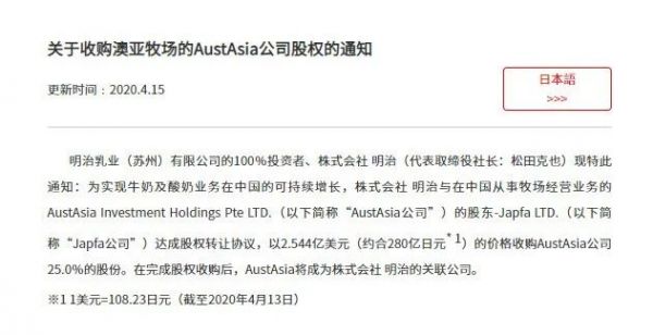 明治方面在一份中文通报中表示,明治乳业(苏州)有限公司的100%投资者、株式会社明治与澳亚公司的股东Japfa公司达成股权转让协议,以约280亿日元的价格收购澳亚公司25.0%的股份。
