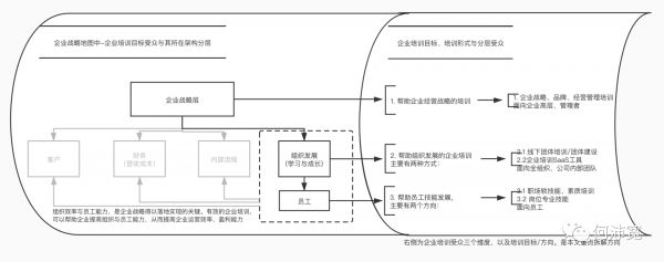 左:企业战略层之下的四个维度(基于卡普兰战略地图模型);右:企业培训三个目标层次